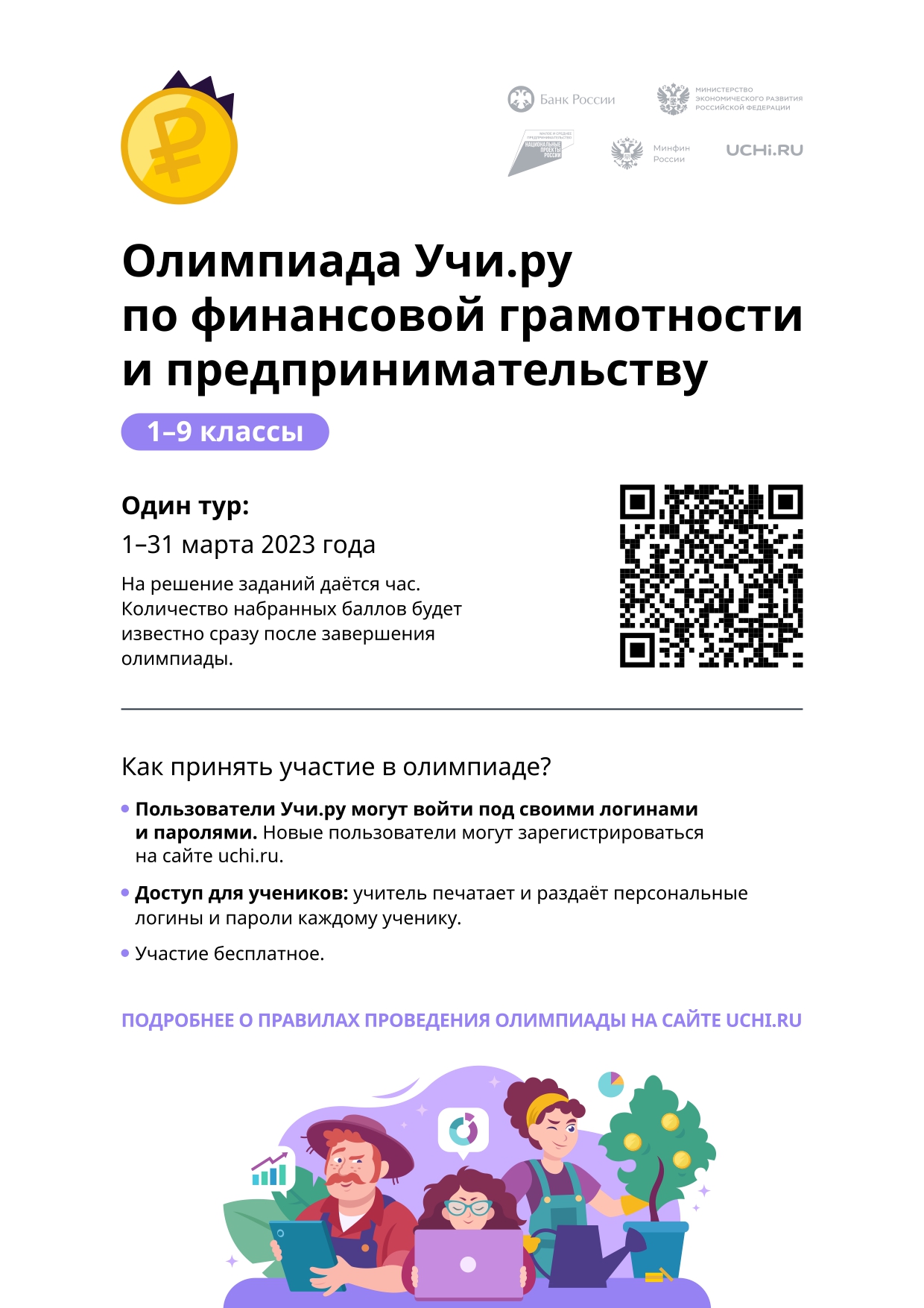 С 1 по 31 марта 2023 года образовательная онлайн-платформа «Учи.ру» совместно с Минфином России, Банком России, Минэкономразвития России, АНО «Национальные приоритеты» реализует некоммерческую просветительскую инициативу – Всероссийскую онлайн-олимпиаду по финансовой грамотности и предпринимательству для учеников 1–9 классов.