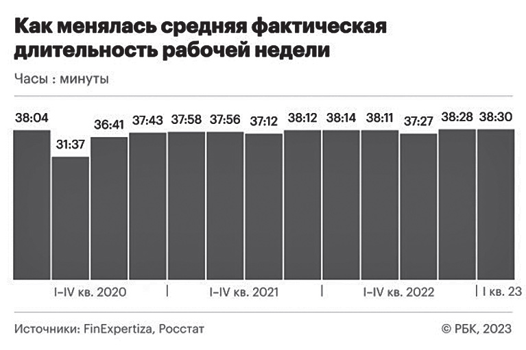 В январе-марте этого года российские работники в среднем трудились по 38 часов 30 минут в неделю. За год фактическая длительность трудовой пятидневки выросла на четверть часа, достигнув максимального значения по крайней мере с четвёртого квартала 2012 года (тогда она составляла 38 часов 29 минут), подсчитала аналитическая служба аудиторско-консалтинговой сети FinExpertiza на основе данных Росстата (исследование компании есть у РБК).