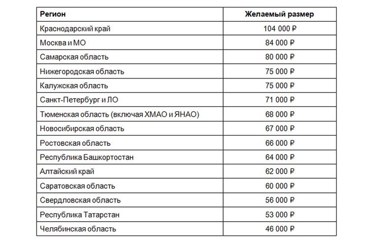 Исследование показало, что опрошенные жители Краснодарского края хотели бы получать пенсию в размере 104 тысяч рублей в месяц. И это самый высокий показатель по стране. На втором месте оказались респонденты из Москвы и Московской области, согласившиеся на ежемесячную выплату в размере в 84 тысяч Тройку регионов с самыми высокими пенсионными ожиданиями замыкает Самарская область: участники опроса из этого региона хотели бы получать 80 тысяч.
