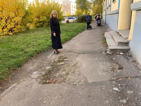 Депутат ЗакСобрания Антонина Кокошникова проверила состояние тротуаров на улице Советской в Ангарске. Ранее с вопросом о ремонте пешеходных дорожек к ней обратилась жительница города нефтехимиков, передвигающаяся на коляске. По итогам проверки популярного у ангарчан маршрута по пути в поликлинику парламентарий убедилась в необходимости проведения работ.