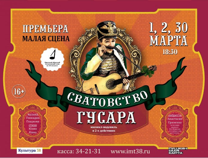 Мюзикл-водевиль «Сватовство гусара» будет идти на Малой сцене театра, премьера состоится 1 и 2 марта. Многим зрителям эта история известна по музыкальному фильму режиссёра Светланы Дружининой «Сватовство гусара». Главные роли в картине, вышедшей на экраны в 1979 году, исполнили Михаил Боярский, Елена Коренева и Андрей Попов. На сцене Иркутского музыкального театра уже шёл спектакль по этому сюжету. Комедия «Женитьба гусара» также на музыку Геннадия Гладкова и стихи Юлия Кима была поставлена в 1992 году.