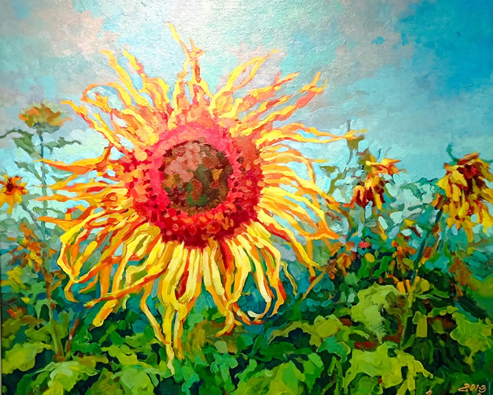 «Любопытный подсолнух», холст, масло, 2019 г. Куратор выставки Полина Ткаченко вручает Галине Тереховой благодарственное письмо от музея истории города Иркутска им.