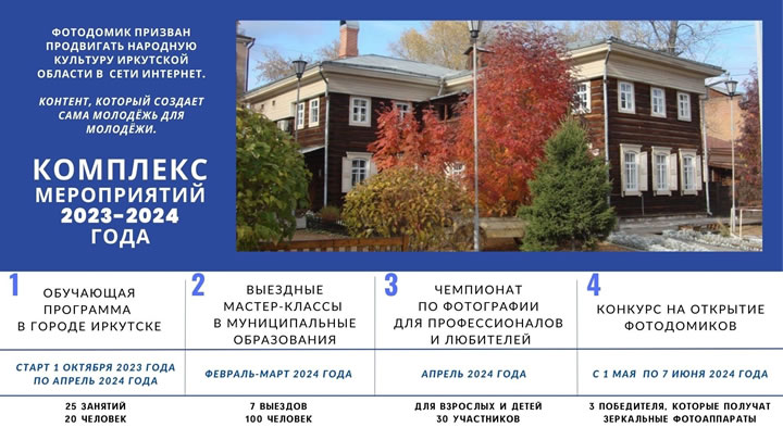 На февраль-март 2024 года запланированы семь выездов в муниципальные образования Иркутской области. Там состоятся мастер-классы по фотографии и мобильной видеосъёмке. Апрель 2024 года: чемпионат по фотографии для фотолюбителей и профессионалов по категориям «Дети» и «Взрослые». С мая по июнь 2024 года состоится конкурс среди Домов культуры Иркутской области на открытие «ФотоДомиков». Три победителя получат зеркальные фотоаппараты и штативы, а также методическую поддержку в течение года.Все подробности – на сайте проекта http://фотодомик38.рф/