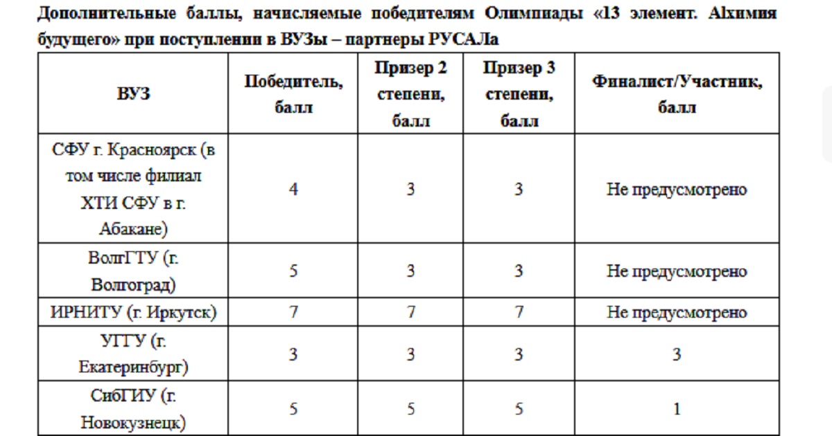 Все школьники, прошедшие отборочный этап конкурса, получат сертификаты участников, незабываемые эмоции и знания о профессии металлург. А победители олимпиады «13 элемент. Alхимия будущего» – дополнительные баллы для поступления в ВУЗы. В первую очередь – СФУ (в том числе Хакасский технический институт), ИРНИТУ, ВолгГТУ, УГГУ, СибГИУ. Победители Олимпиады также получат ценные подарки от РУСАЛа.