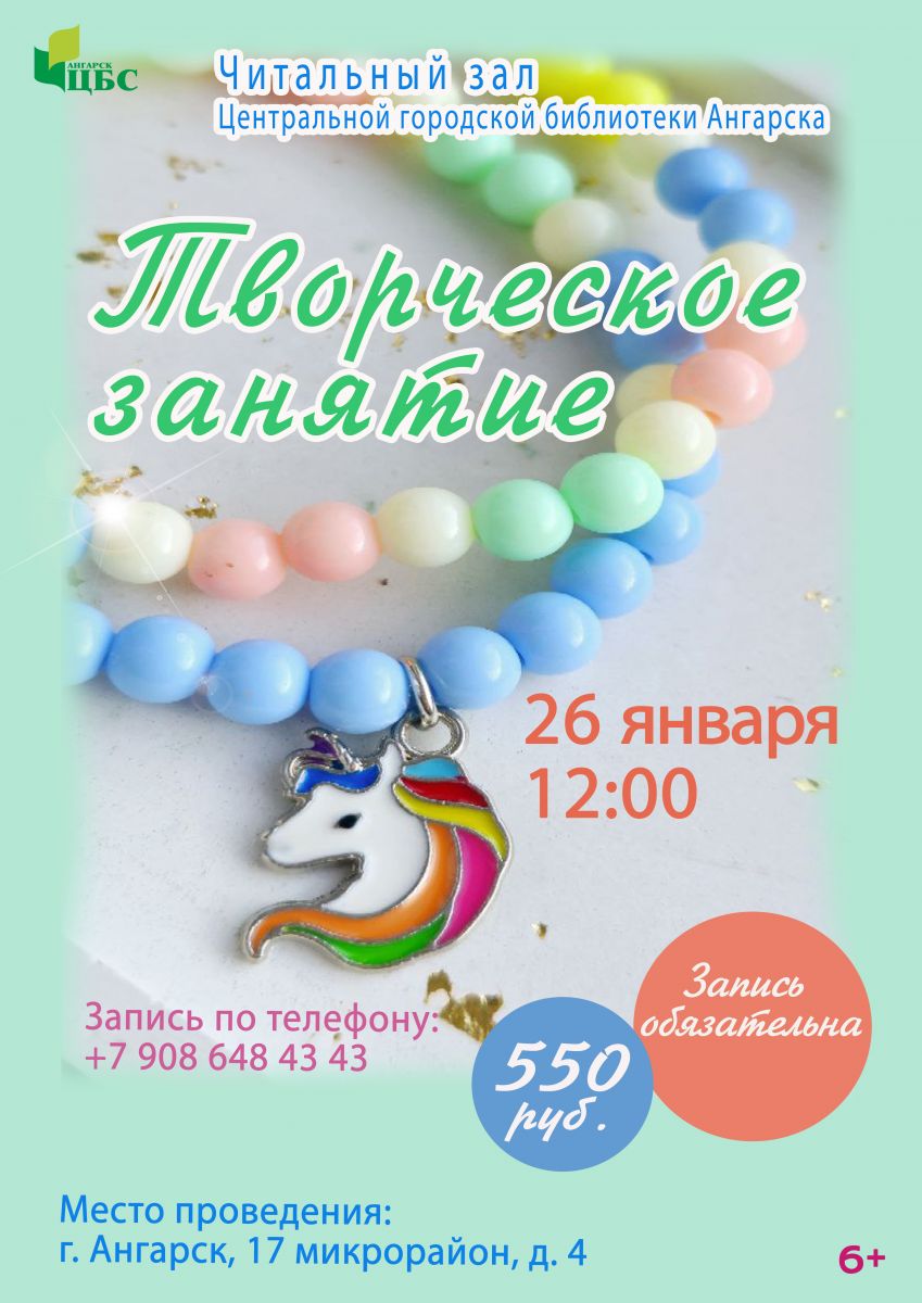 Творческое занятие 26 января в 12:00 Читальный зал Центральной городской библиотеки Ангарска: г. Ангарск, 17 микрорайон, 4 Запись по телефону обязательна: +7 908 648 43 43 Стоимость - 550 руб.