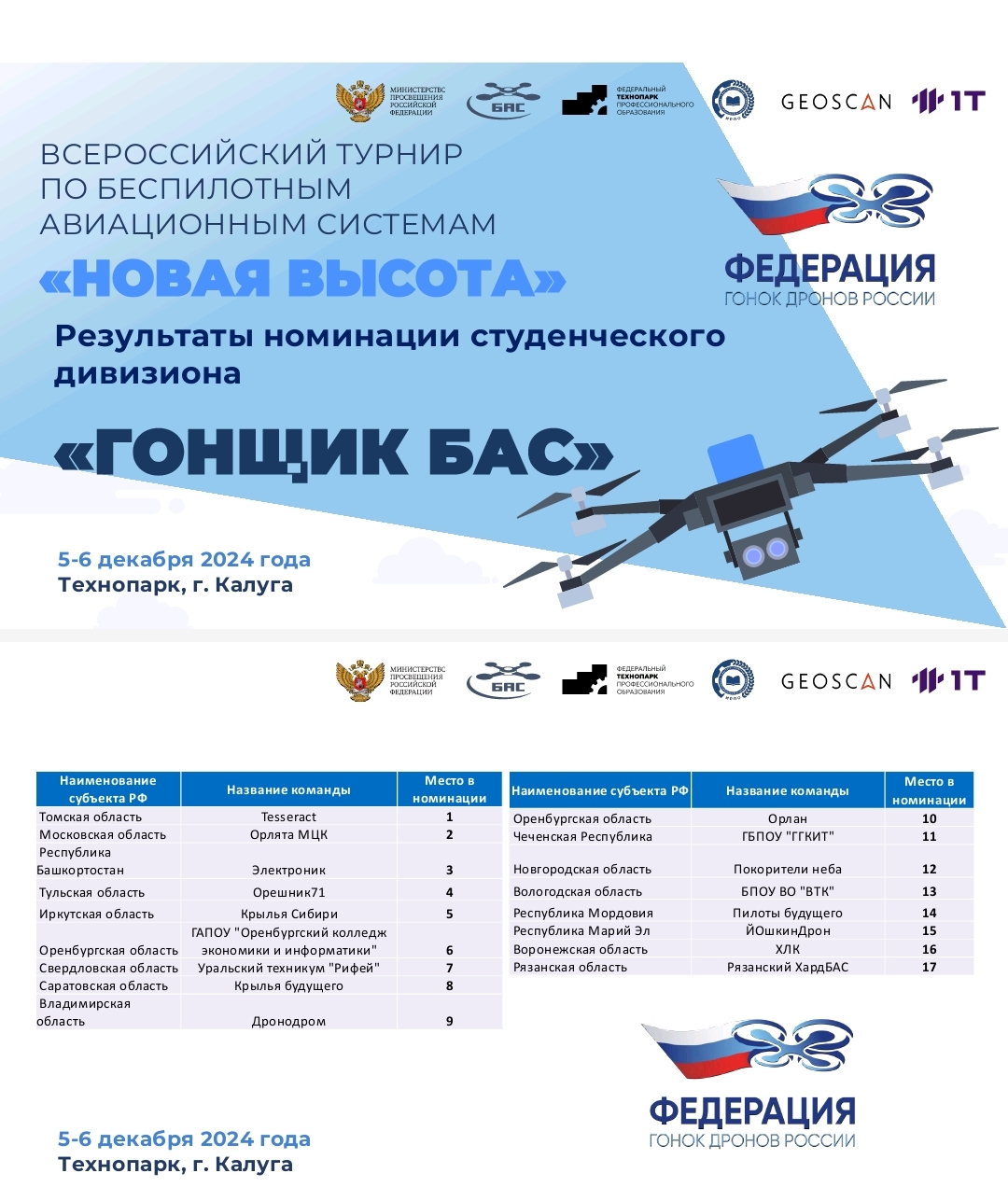 Ребята принимали участие в номинации "Гонщик БАС" студенческого дивизиона. Перед командой стояла сложная задача — выполнить полеты без ошибок и с наименьшим временем. Соперники были очень серьезные, но наша команда справилась на отлично и вошла в ПЯТЕРКУ лучших команд России!
