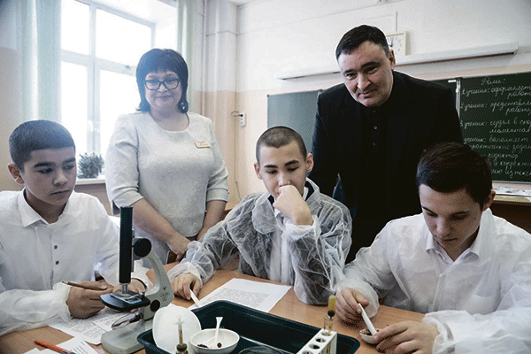 Идет лабораторная работа в предпрофильном классе школы № 15 — ученики исследуют бруснику и кедровые орехи, чтобы понять, как дикоросы помогают выжить заблудившимся в тайге. Школьники смешивают пюре брусники с йодом и содой — реакция демонстрирует, что в ягоде много витамина С. Мэр Руслан Болотов, как видите, с удовольствием наблюдает за процессом и даже со знанием дела рассказал будущим медикам, как много силы и энергии дает человеку кедровый орех