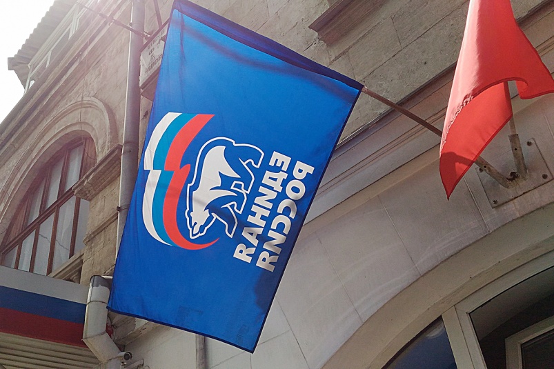 Представление посмотрели инвалиды колясочники, дети с ментальными нарушениями здоровья и другие Флаг "Единой России".