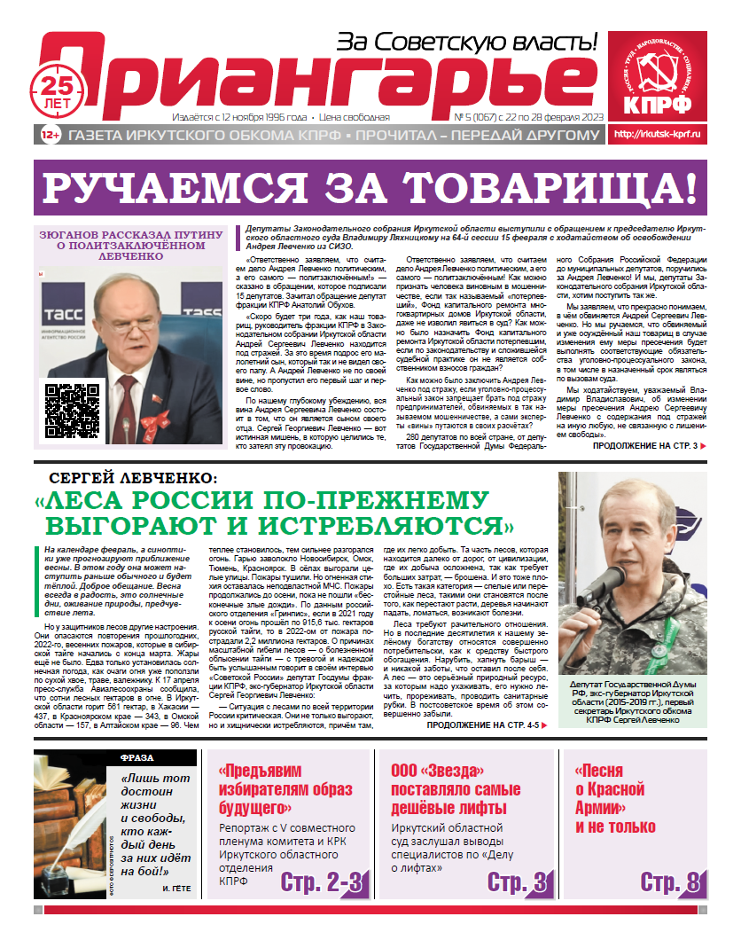 Актуальные новости о главных политических и экономических события региона, а также деятельности Компартии читайте в новом выпуске газеты Иркутского обкома КПРФ «Приангарье» №5 (1067).