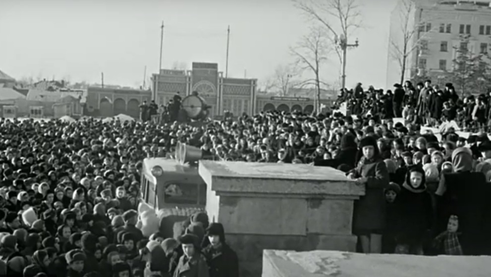 Сохранились кадры хроники, показывающие, как хабаровчане слушают известие о смерти вождя из громкоговорителя возле кинотеатра «Гигант».