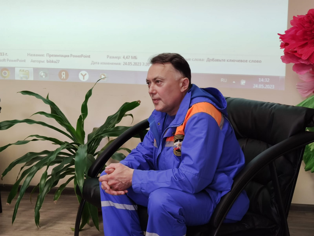 В рамках проекта «Люди мужественных профессий» 24 мая 2023 года в МКУК «Детская библиотека» организована патриотическая встреча в формате открытого диалога с начальником Северного поисково – спасательного отряда областно