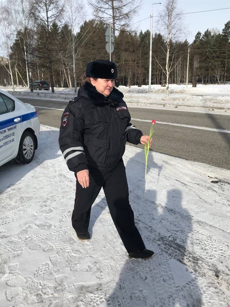 В преддверии самого прекрасного весеннего праздника в Саянске прошла необычная акция. Сотрудники ГИБДД дарили женщинам цветы и поздравляли с 8 Марта.