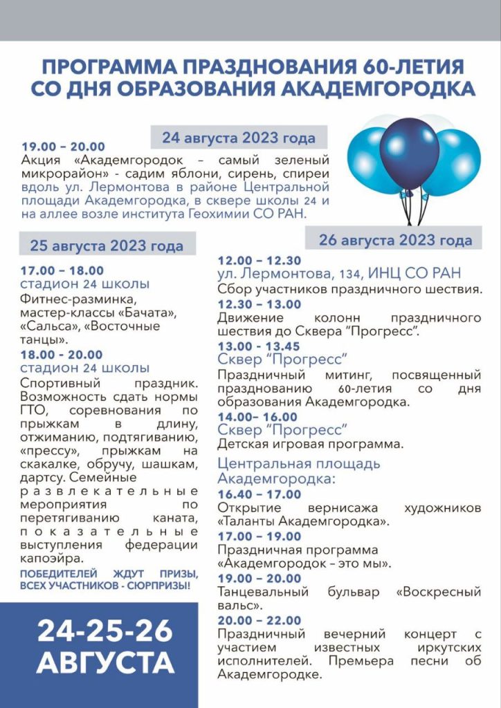 Микрорайону Академгородок в этом году исполнилось 60 лет. Празднование этого события будет проходить в течение трех дней – с 24 по 26 августа.