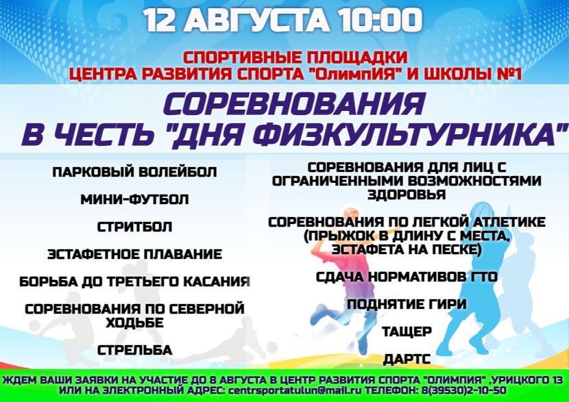 Этот год не стал исключением: приглашаем вас на День физкультурника, который пройдет 12 августа. Начиная с 10 часов на спортивных площадках Центра развития спорта "ОлимпИЯ" и спортивных площадках школы №1 начнутся соревнования.