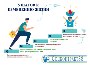 встать на учет в ЦЗН качестве безработного или ищущего работу; зарегистрироваться в информационно-аналитической системе «Работа в России»; осуществить поиск работы с последующим заключением трудового договора в период действия социального контракта; пройти в период действия социального контракта профессиональное обучение или получить дополнительное профессиональное образование, если указанное обязательство установлено социальным контрактом; пройти в период действия социального контракта стажировку с последующим заключением трудового договора, если указанное обязательство установлено социальным контрактом; ежемесячно предоставлять в орган социальной защиты населения документы, подтверждающие факт выполнения мероприятий программы социальной адаптации; уведомить орган социальной защиты населения в течение 3 рабочих дней о досрочном прекращении выполнения мероприятий программы социальной адаптации, трудовой деятельности в период действия социального контракта; предоставлять по запросу органа социальной защиты населения информацию об условиях жизни гражданина (семьи гражданина) в течение 12 месяцев со дня окончания срока действия социального контракта.Кроме того, в социальном контракте указываются следующие требования к конечному результату: