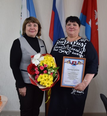 Наталья Владимировна вручила Почётную грамоту мэра за многолетний труд и высокий профессионализм Наталье Георгиевне Землянской, уч. Буринская Дача, Светлане Васильевне Поповой, уч. Стибутовский.