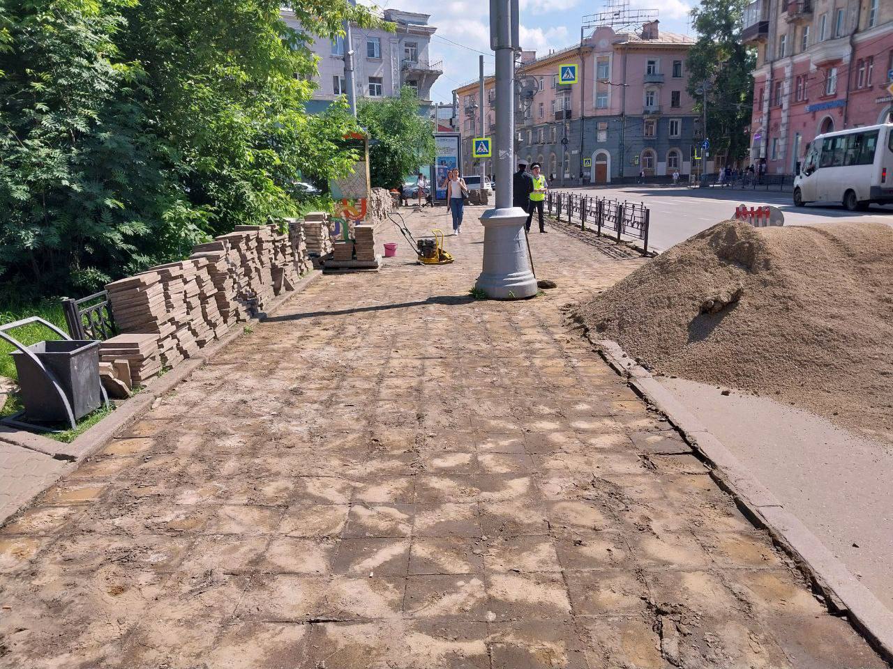 На улице Ленина в Иркутске ремонтируют тротуарную плитку. Работы ведут на участке возле остановки общественного транспорта «Художественный музей».