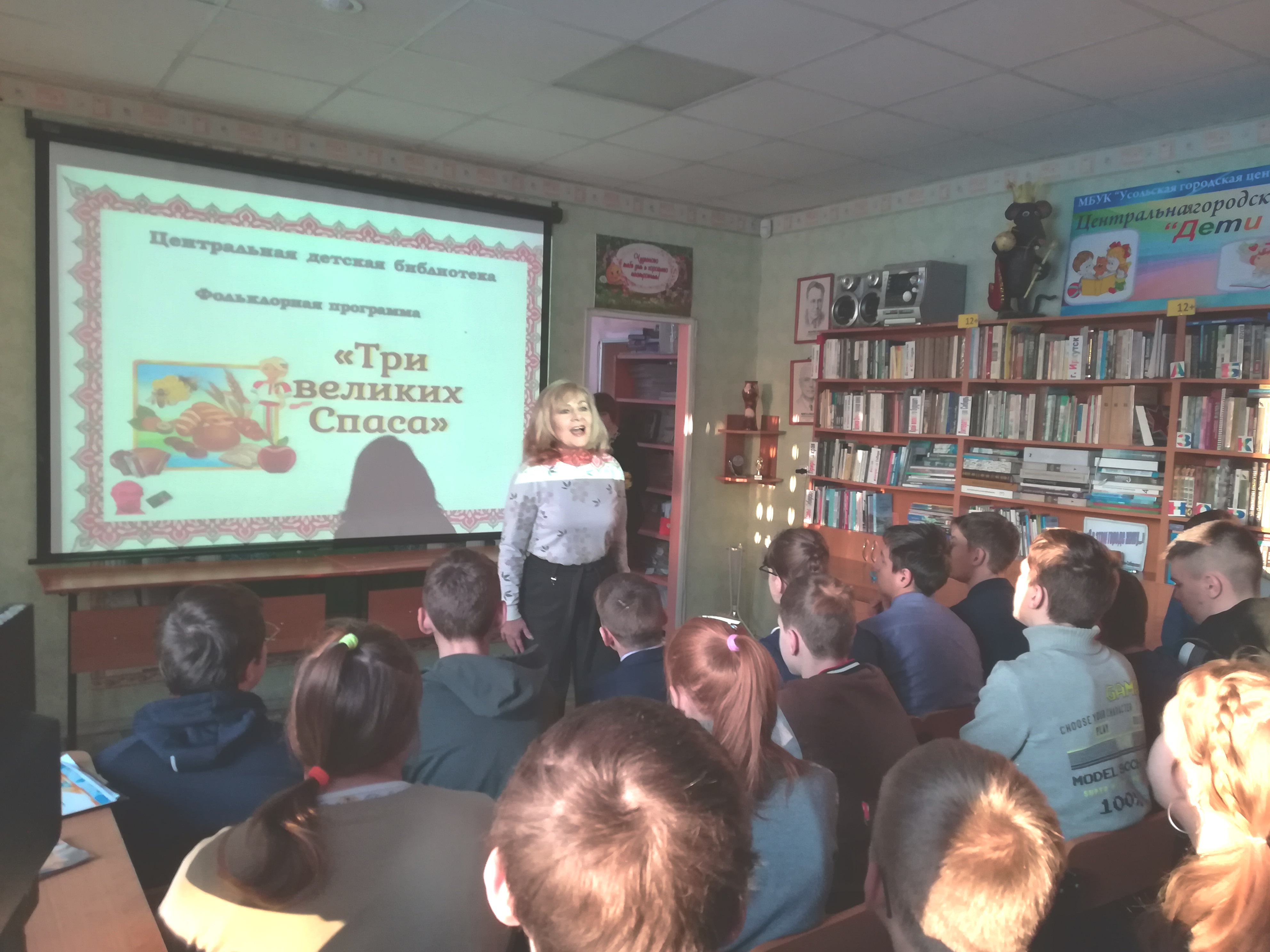 С целью приобщения детей к православной культуре и возрождения традиций народных праздников 29 ноября центральная детская библиотека провела фольклорную программу «Три великих Спаса». Участниками мероприятия стали держатели Пушкинских карт: обучающиеся 8-9 классов ГОКУ средняя коррекционная школа №1.