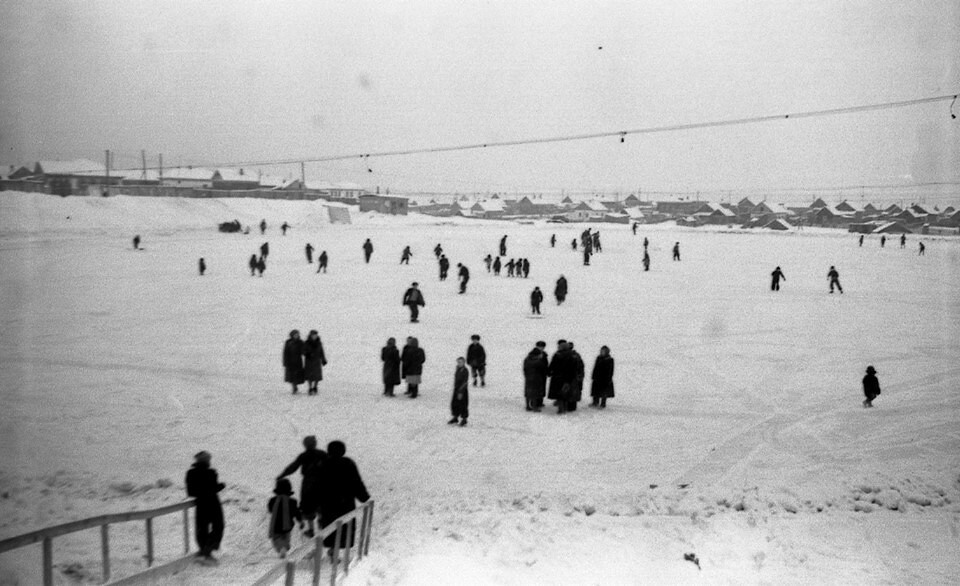 Горожане проводят досуг на катке стадиона «Строитель»Врач шелеховской поликлиники читает лекцию горожанам на агитплощадке 11-го квартала. Июнь 1974 г. (источник: https://goskatalog.ru)