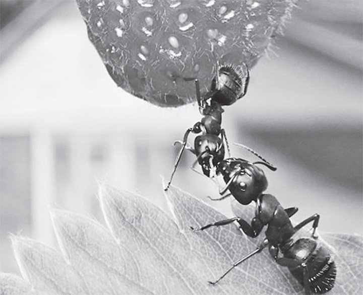 Если рыжие лесные муравьи относят ся к хищникам и санитарам леса , то чёрные садовые муравьи на наших участках скорее « скотоводы ». Чёрные садовые муравьи специально разводят и разносят тлю , и используют насеко мое как « дойную корову », чтобы погло щать её сахаристые выделения . Если для лесных участков это полезно , то для плодовых садов это безусловный вред . Заключается он в том , что , активно раз множаясь , тля высасывает соки из молодых листочков и повреждает точку роста . При этом ветки деревьев значи тельно ослабляются и уродуются , на сладких выделениях начинает образо вываться сажистый гриб .