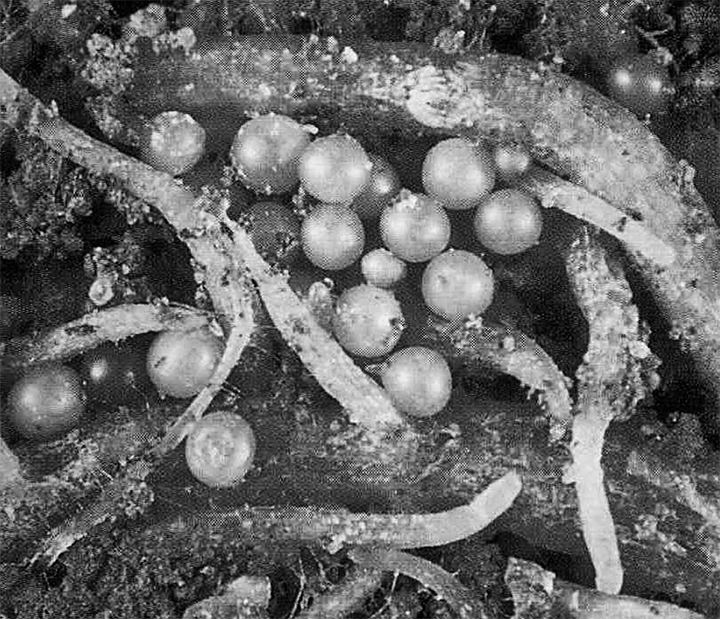 Зимуют цисты картофельной нематоды на глубине 10-20 см. Выход личинок из цист начинается весной при благоприятных условиях температуры (18-21 о С) и влажности почвы (70%). Личинки проникают в корни, высасывают клеточный сок и отравляют растение своими выделениями. В результате растения отстают в росте, ослабевают, обнаруживается пожелтение, увядание и гибель листьев. Личинки вредят корням картофеля в течение всего вегетационного периода. После отмирания корней картофеля цисты остаются в почве и зимуют, сохраняя жизнеспособность до 10 и более лет.