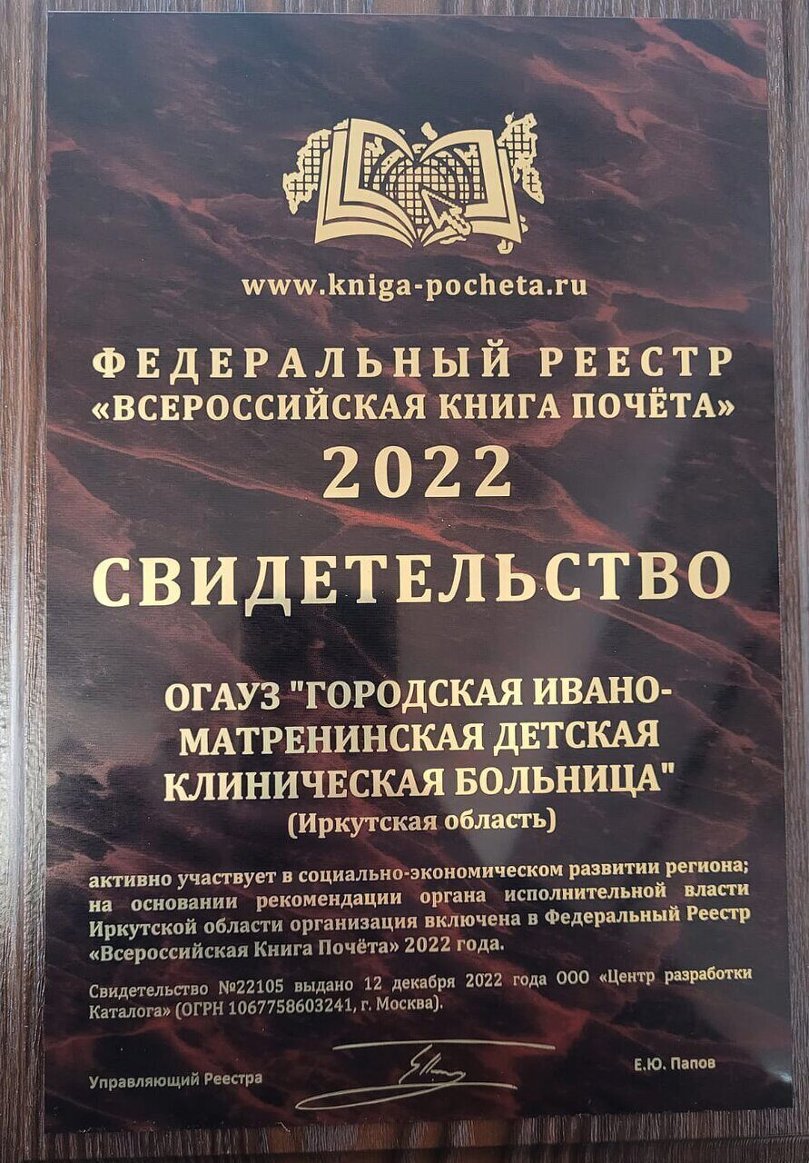 Ивано-Матренинская детская клиническая больница внесена в Федеральный Реестр «Всероссийская Книга Почета» 2022 года!