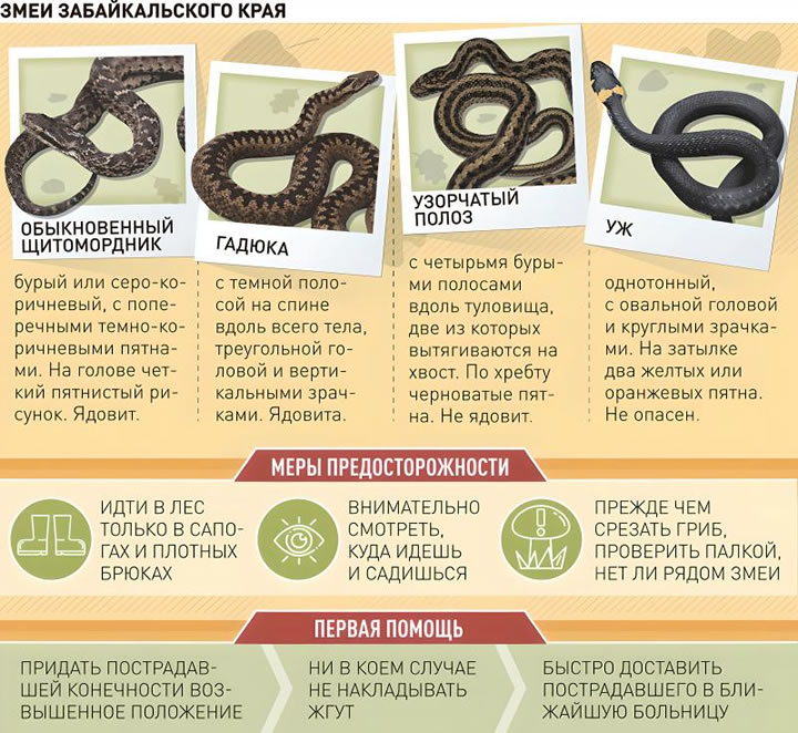 В Иркутской области обитают два семейства ядовитых змей – гадюковые и гремучники. Встречаются они в различных уголках региона. Часто люди, увидев змею, думают, что это безобидный ужик, и пытаются поймать или погладить его. Однако следует помнить, что это может оказаться гадюка или щитомордник.