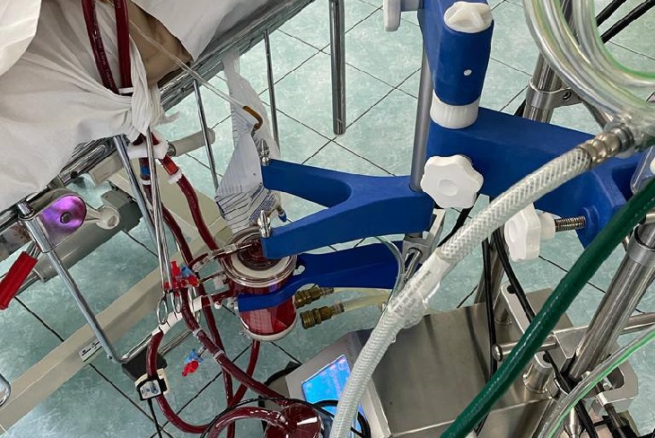 — Для спасения жизни человека сотрудники больницы применили метод вено-артериальной экстракорпоральной мембранной оксигенации (ЭКМО). Его суть заключается в том, что аппарат забирает на себя часть работы сердца и легких. Через специальную трубку, проведенную через бедренную вену к сердцу, часть крови забирается в аппарат. После чего кровь проходит через устройство для насыщения кислородом. Далее центрифужный насос нагнетает кровь через бедренную артерию в нисходящую аорту. В результате перечисленных действий с сердца снимается нагрузка и появляется время и возможность для стабилизации состояния пациента.