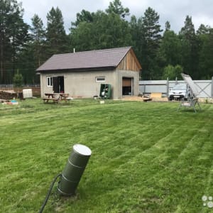 Большая часть участка засеяна красивым зеленым газоном, у въезда в ворота отсыпана площадка для автомобилей, а также установлены, ограждающие бордюры с местами для цветочных или древесных насаждений.