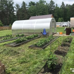 Также на участке установлена теплица из поликарбоната площадью приблизительно 12 кв.м., за теплицей находится ровная зона из грядок и отдельная площадь под кустарниковые насаждения: посажены малина, всесезонная клубника, смородина, груша, яблоня.